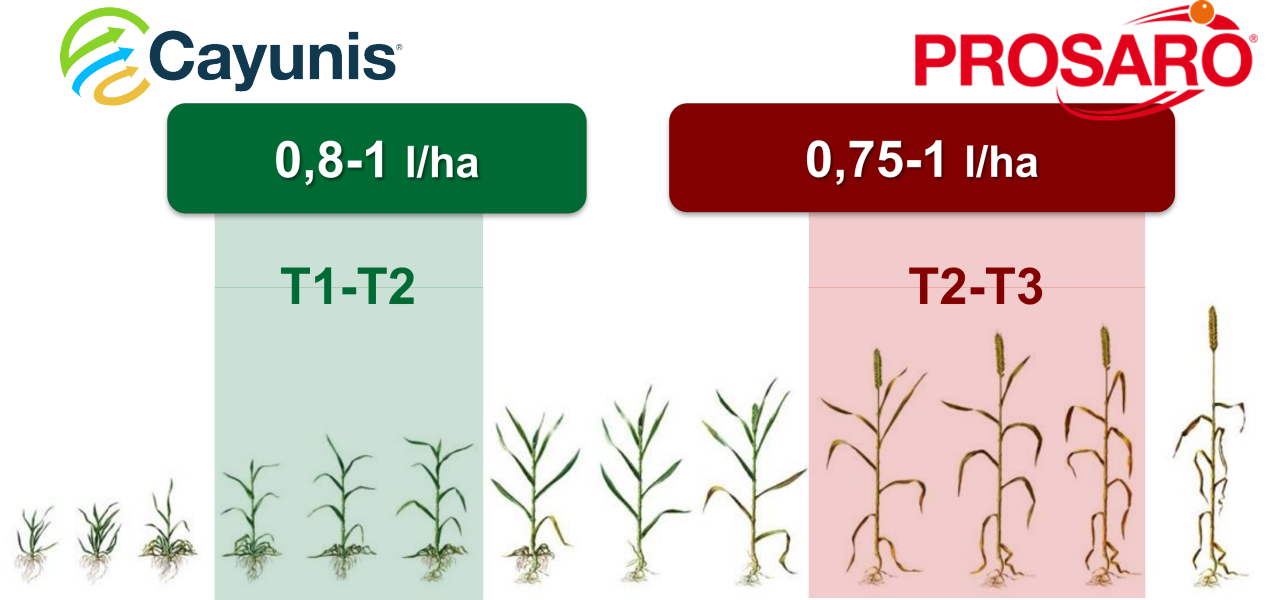 Široké aplikační okno: Cayunis® lze aplikovat od začátku sloupkování do konce kvetení u pšenice, žita a tritikale (BBCH 30–69). Ječmen lze ošetřovat od začátku sloupkování do počátku kvetení (BBCH 30–61) podle nástupu chorob.